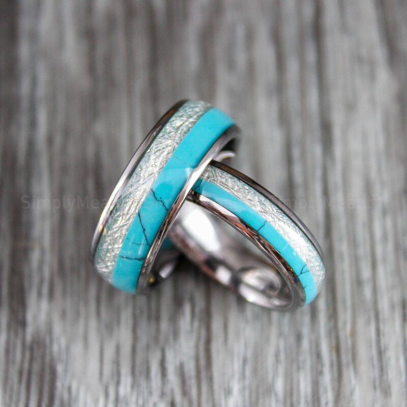 $248.00Turquoise Rings, Turquoise Wedding Bands, Silver Tungsten Bands with Meteorite and Turquoise Inlay